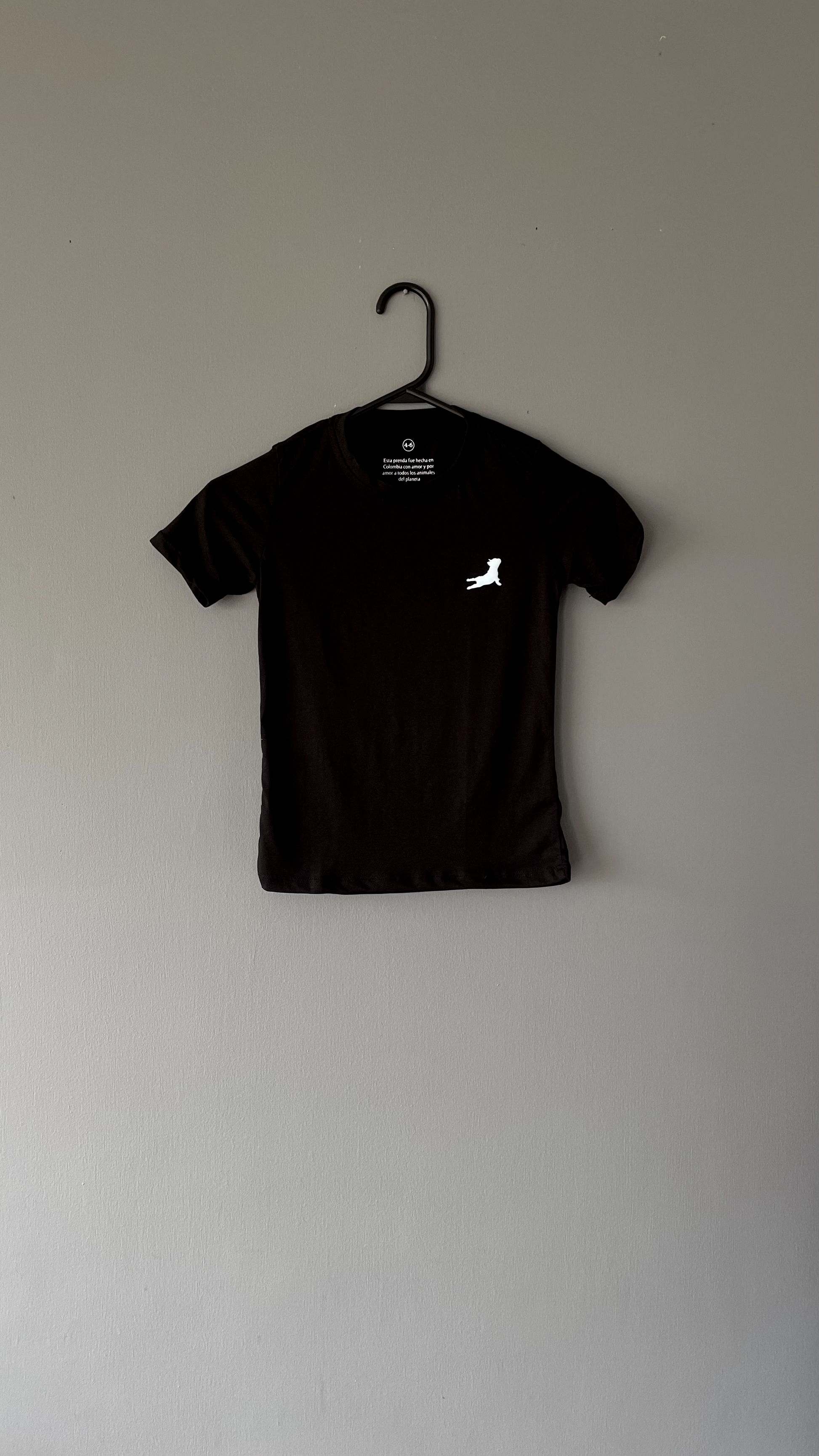 Camiseta cuello redondo color Negro de molde regular, elaborada en tela 100% algodón, intervenida con estampado en policromía de Bulldog en Posición Yoga en semialta densidad azul pastel en frente superior izquierdo.